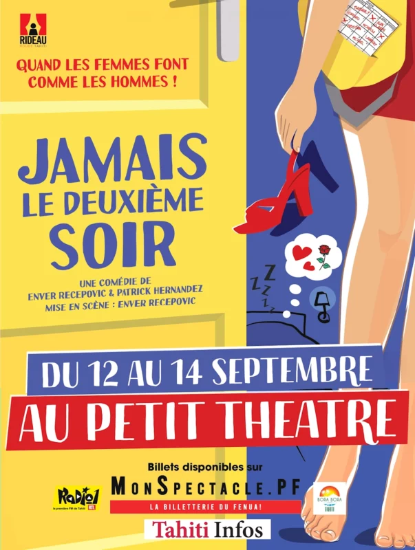 Rideau Rouge Tahiti présente du 12 au 14 septembre 2025, la comédie qui a déjà conquis plus de 900 000 spectateurs : « Jamais le 2ème soir ». Un spectacle drôle et piquant qui bouscule les rôles entre hommes et femmes, à découvrir au Petit Théâtre de la Maison de la Culture.