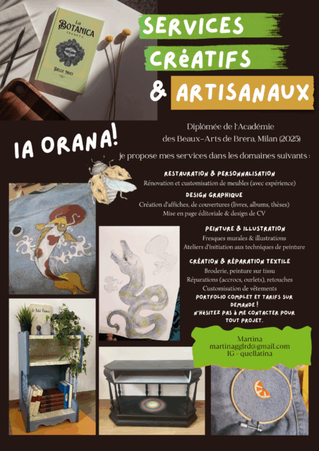 Diplômée en beaux-arts à Milan, en Italie, et avec plus de deux ans d’expérience dans le domaine artistique, je propose mes services dans les domaines suivants :