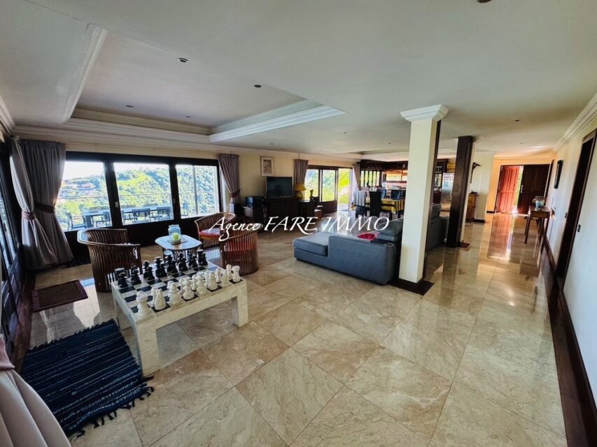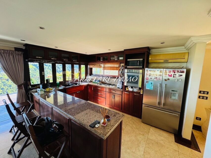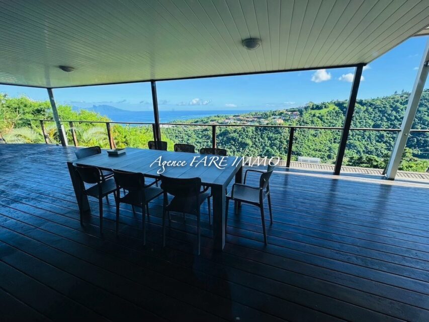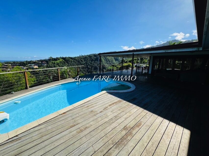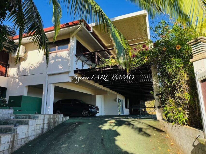je vous propose à la vente cette très belle maison de 2007 construite dans des matériaux nobles d’une surface d’env 200m2 habitables comprenant 2 chambres climatisées et 1 salle d’eau ainsi qu’une master room climatisée d’env 30m2 avec dressing et salle d’eau privative, une très belle pièce de vie d’env 90 m2 avec vue imprenable sur Moorea, un deck d’env 150m2 avec coin piscine, garage couvert pour 4/5 voitures, 1 bureau, buanderie, wc indépendant et 2 celliers, le tout sur un terrain clos d’env 900M2.