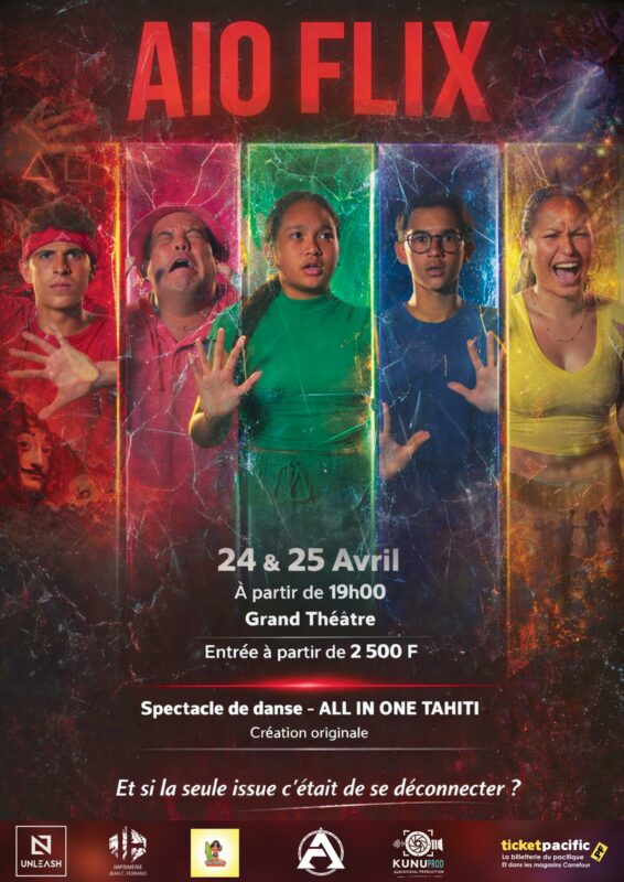 L’école de danse All In One Tahiti signe ici une création originale audacieuse. Le point de départ d’AIO FLIX ? Notre quotidien ultra-connecté. Dans un monde où tout va toujours plus vite, cinq jeunes vivent au rythme effréné des écrans et du monde numérique. Mais un jour, leur réalité bascule : ils se retrouvent mystérieusement aspirés dans un univers inconnu dont ils ne connaissent ni les règles… ni la sortie.