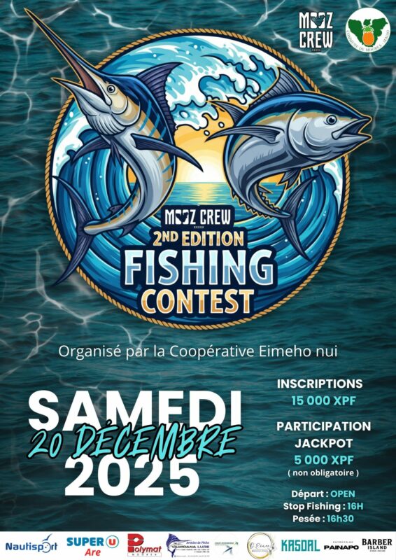 Après une première édition qui a marqué les esprits, le Mooz Crew Fishing Contest revient en force pour sa 2ᵉ édition, le samedi 20 décembre 2025, au quai des pêcheurs de Paopao – Moorea. Une journée entièrement dédiée à la pêche, au partage et à l’ambiance unique de Moorea, organisée par la Coopérative Eimeho Nui Paopao.