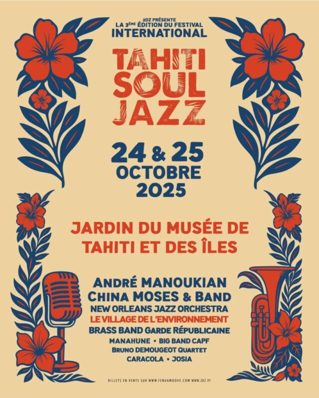Produit par 2DZ Productions avec le soutien du Conservatoire artistique de Polynésie, du Musée de Tahiti et des Îles, de Tahiti Tourisme, de la Direction de l’Environnement et de la Mission culturelle du Haut-Commissariat, le Tahiti Soul Jazz se positionne comme un événement phare du Pacifique, à l’image des plus grands festivals de jazz du monde.