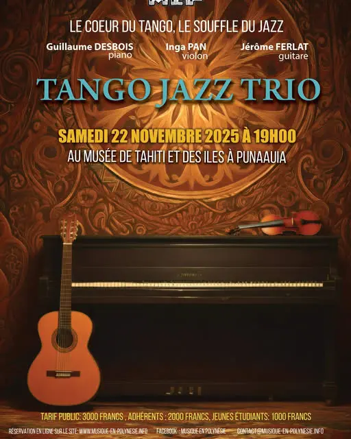 Le samedi 22 novembre 2025, le Te Fare Iamanaha – Musée de Tahiti et des Îles à Punaauia vibrera au son du Tango Jazz Trio, pour une soirée exceptionnelle où s’entrelacent émotion, virtuosité et improvisation. De 19h à 20h30, laissez-vous transporter par un voyage musical entre Buenos Aires et le jazz moderne, dans un cadre aussi intime qu’élégant, face au lagon.