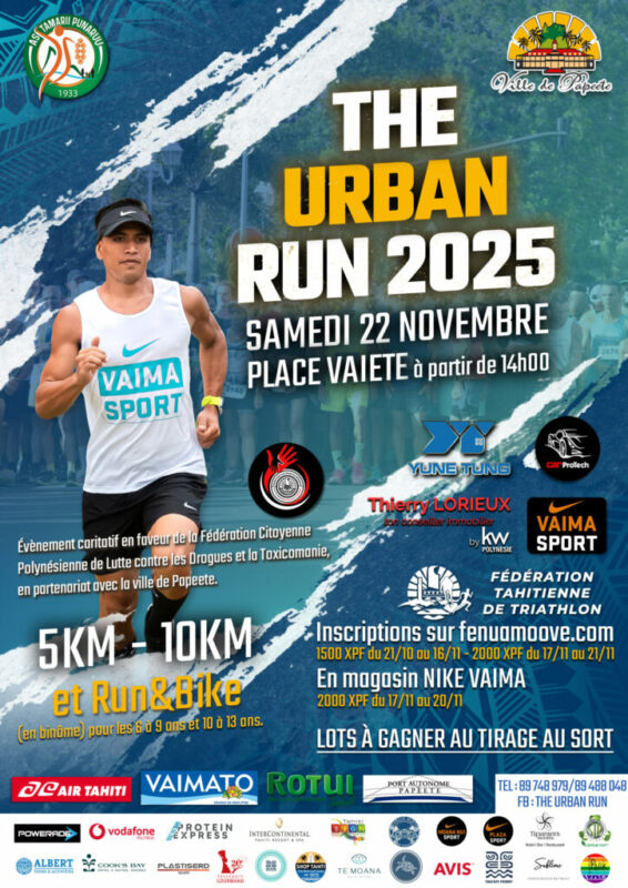 Le samedi 22 novembre 2025, les rues de Papeete accueilleront une nouvelle édition de THE URBAN RUN 2025, une course urbaine alliant sport, convivialité et solidarité. Organisé par l’association sportive Tamarii Punaruu avec le soutien de la Fédération Tahitienne de Triathlon et de la ville de Papeete, cet événement caritatif se mobilise cette année au profit de la Fédération Citoyenne Polynésienne de Lutte contre les Drogues et la Toxicomanie.