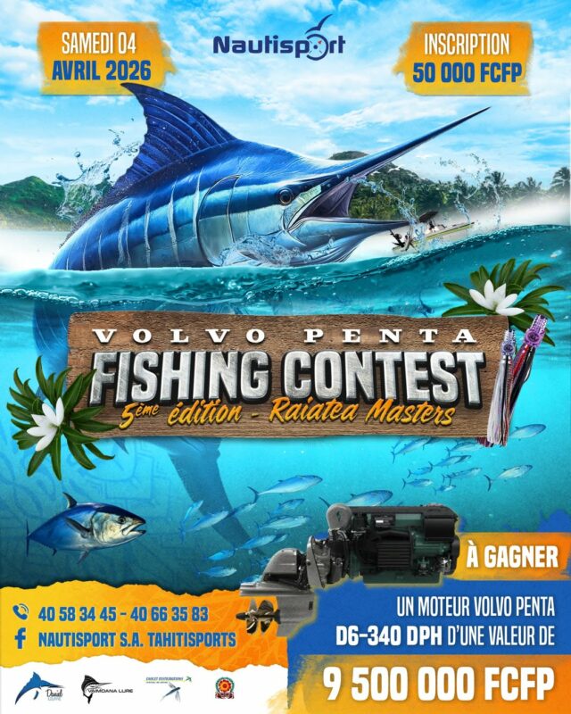 Les passionnés de pêche ont rendez-vous à Uturoa, Raiatea, le samedi 4 avril 2026, pour la 5ᵉ édition du Volvo Penta Fishing Contest, un événement incontournable organisé par Nautisport. Une compétition exceptionnelle où stratégie, adrénaline et convivialité seront au cœur de la journée… et où un moteur Volvo Penta D6-340 DPH d’une valeur de 9.500.000 XPF sera mis en jeu !