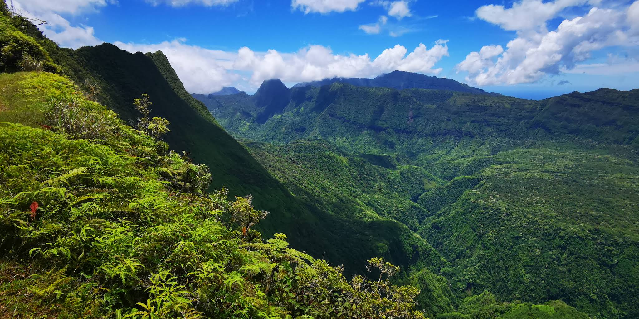 Continuez encore 600 mètres pour atteindre le tremplin à parapente. Attention : cette zone n’est pas sécurisée, prudence donc face au vide. De là, le panorama est à couper le souffle. La vallée de la Fautaua s’ouvre en contrebas avec la cascade de Loti. Le regard porte aussi jusqu’au mont Aorai, au diadème et à d’autres reliefs emblématiques de Tahiti.